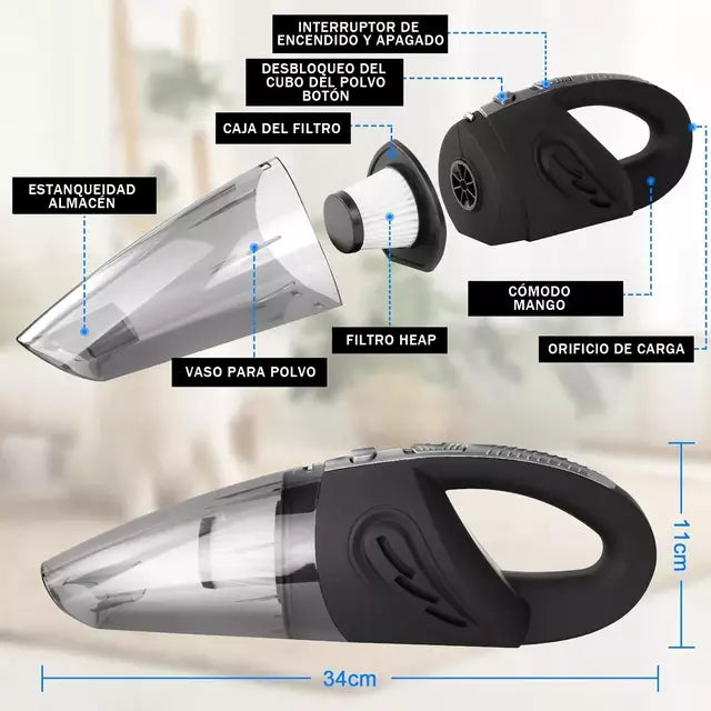 Disfruta de una limpieza profunda donde quieras con nuestra Aspiradora de Mano con tecnología ciclónica, diseñada para ofrecer una succión potente, constante y sin cables. Ideal para el hogar, oficina o automóvil.